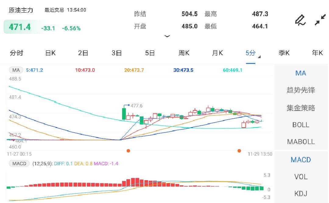 11月29日,邦内期市开盘,原油期货代价一度触及跌停,目前主力合约跌幅进步5%。